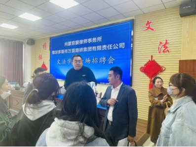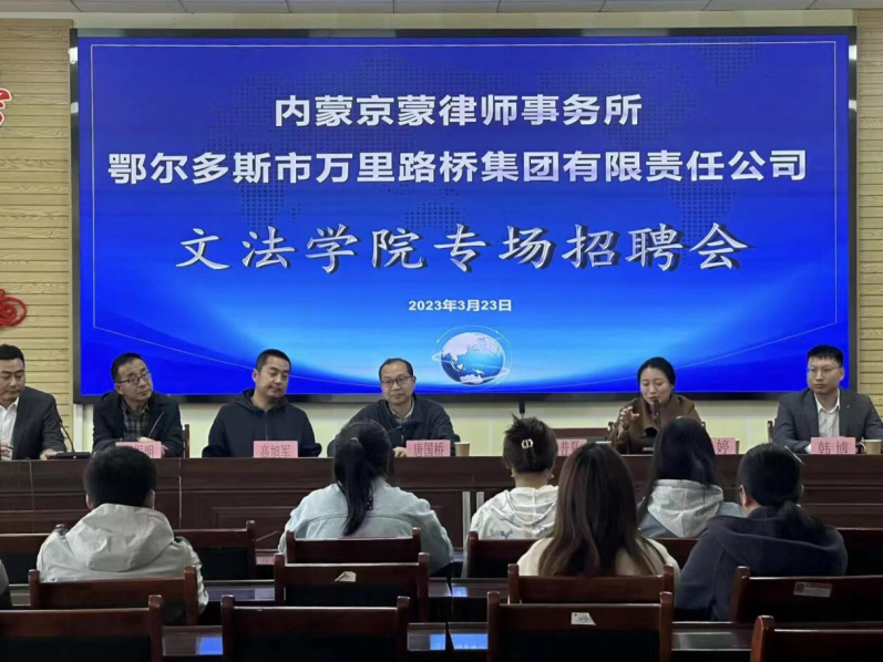2023年3月23日下午,内蒙京蒙律师事务所和鄂尔多斯市万里路桥集团有限责任公司应邀在明德楼东A411举办法学、汉语言文学、和秘书专业的专场招聘会。内蒙京蒙律师事务所主任段普复、执业律师韩博,鄂尔多斯市万里路桥集团有限责任公司常务副总乔婷、经营副总高旭军一行到访太阳集团tyc138。太阳集团tyc138党委副书记兼副院长唐国桥、法学系副教授郝振明、毕业班班主任以及全体在校毕业生参加了此次招聘会。
