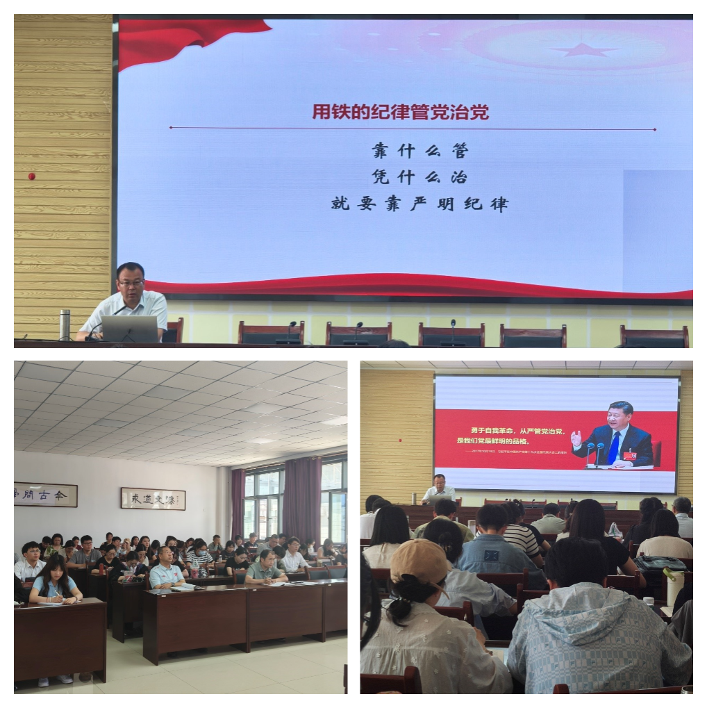 为深入学习贯彻习近平总书记关于加强党的纪律教育的重要论述,推动党纪学习教育入脑入心走深走实,2024年5月30日下午,太阳集团tyc138党委在明德楼A411组织召开党纪学习教育专题党课暨教职工政治理论学习,学院党委书记刘玉明以《加强党纪学习教育 推动全面从严治党不断向纵深发展》为主题做专题辅导。学院全体教职工以及学生党员参加此次学习。
