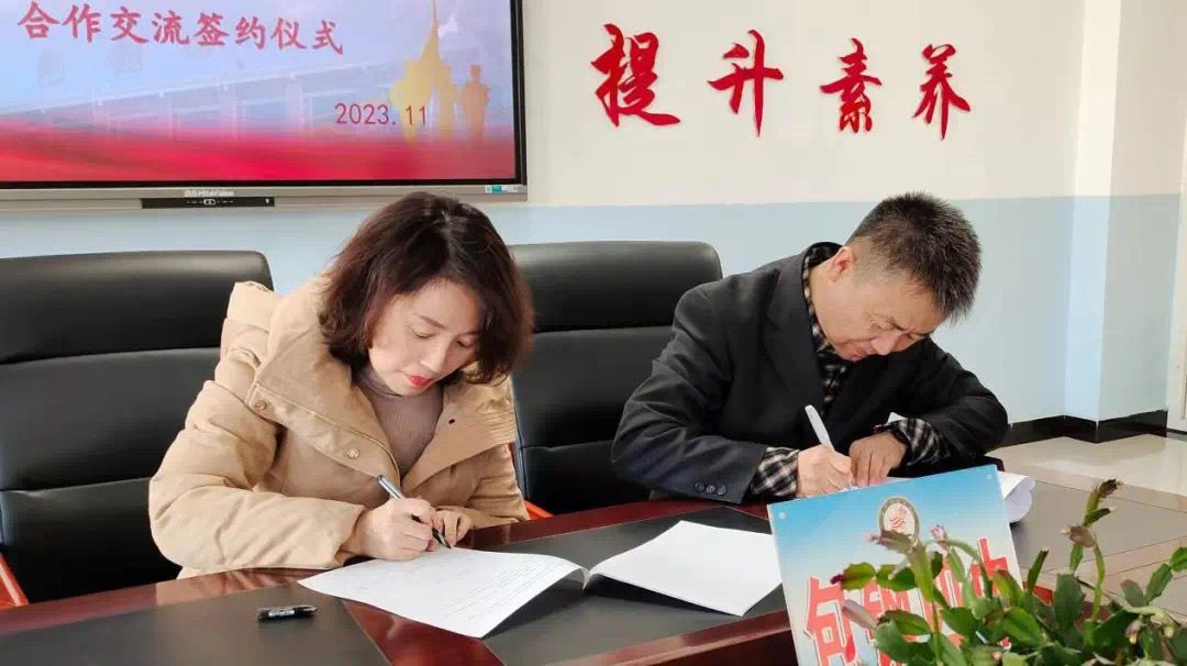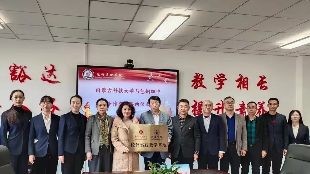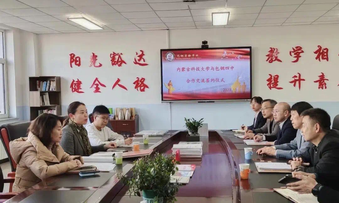 2023年11月16日下午太阳集团tyc138包钢四中校外实践教学基地签约授牌仪式在包钢四中办公楼三楼会议室举行。太阳集团tyc138副院长王继霞、学科语文教育中心副主任包玉琼、学科语文硕士生代表、包钢四中校长王建忠、党总支书记杨力及各学科骨干出席了本次签约仪式。