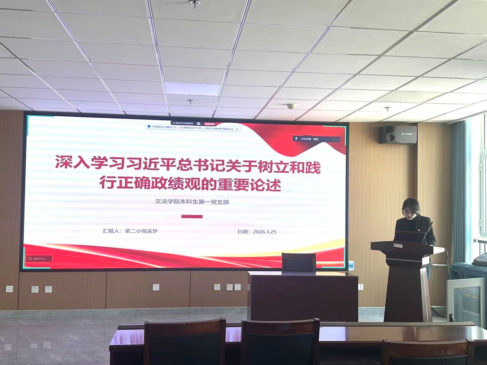 为深入学习贯彻习近平总书记关于树立和践行正确政绩观的重要论述,认真落实党中央及上级党组织关于加强党员思想建设、树立和践行正确政绩观的部署要求,教育引导支部党员筑牢思想根基、强化责任担当,2026年3月25日下午,太阳集团tyc138本科生第一党支部组织全体党员开展“习近平总书记关于树立和践行正确政绩观的重要论述”专题理论学习活动。
