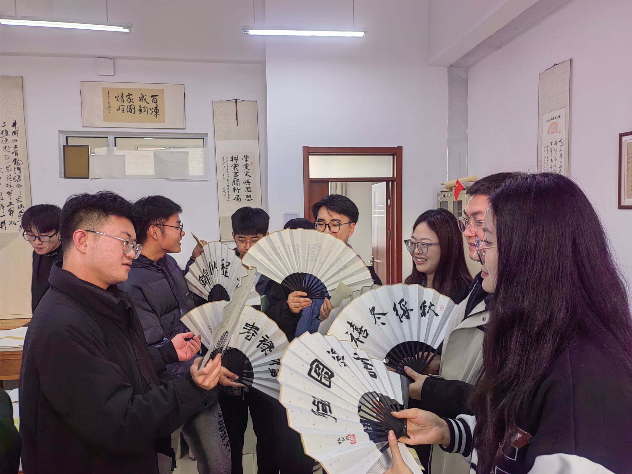活动现场气氛热烈,党员同志们积极参与,共同感受书法艺术的独特魅力。活动伊始,党支部为每位党员同志发放了折扇和书签作为书写载体,笔、墨、纸、砚一应俱全。同志们挥毫泼墨,有的书写经典诗词,有的则创作励志话语,一笔一划尽显对书法艺术的热爱与敬意,充分展现了党员同志们的艺术修养与个性风采。活动接近尾声时,全体党员同志手持自己的书法作品合影留念,记录下这一珍贵时刻。
