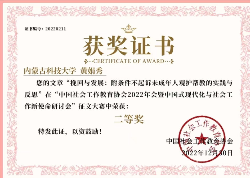 本届年会议程主要包括开幕式、协会工作会议、专家主题发言和大会发言、闭幕大会等板块。在闭幕大会优秀论文颁奖环节,中国社会工作教育协会学术委员会主席王思斌教授宣读了优秀论文获奖名单。社会工作硕士(MSW)教育中心研究生黄娟秀同学的论文《挽回与发展:附条件不起诉未成年人观护帮教的实践与反思》获得中国社会工作教育协会2022年会暨“中国式现代化与社会工作新使命研讨会”优秀论文二等奖。
