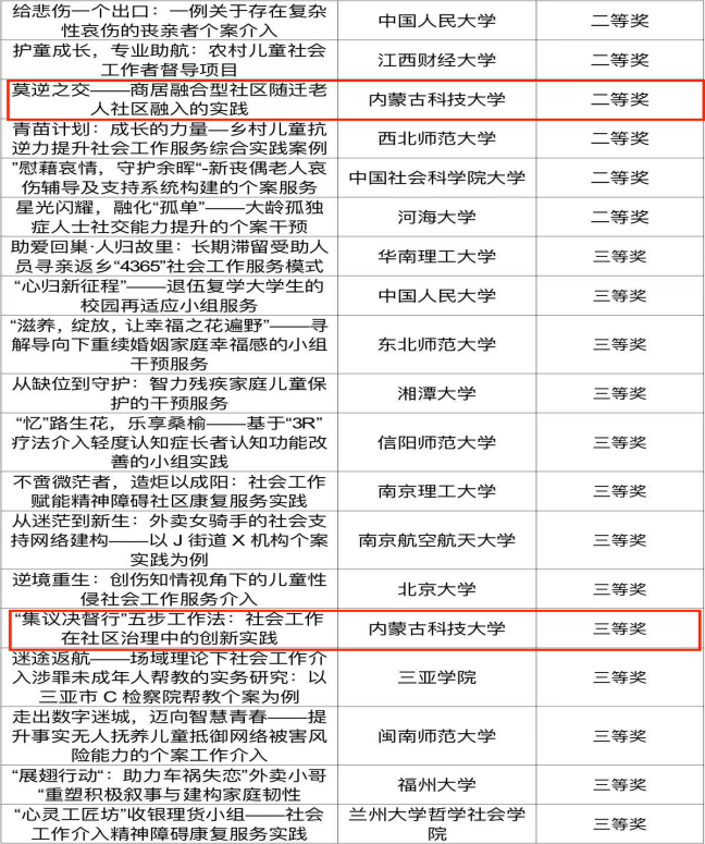 本次大赛全国共有69所MSW研究生培养单位的案例入选全国百强,且仅有包括华南理工大学、华中科技大学、中国社会科学院大学等九所MSW研究生培养单位选派的案例全部入围百强。我院王蕾老师指导,韦翠香、张晓、商宇泽、付祖英、李婷婷同学申报的案例《向阳而生、逆风飞扬——优势视角助力困境儿童社会融入》入围全国百强案例