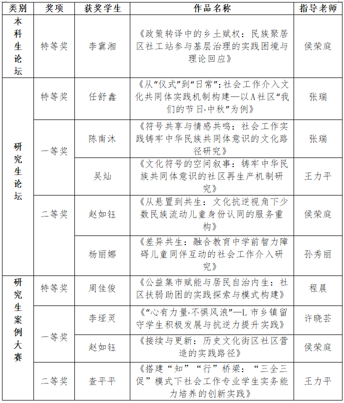 本届大赛共收到参赛作品118篇,下午同步设立本科生论坛、研究生论坛和研究生案例大赛3个分论坛。我院学子聚焦社区治理、乡村振兴、铸牢中华民族共同体意识等前沿议题,作品凭借扎实的理论根基、创新的实践模式和鲜明的时代特色,在评选中脱颖而出。获奖名单如下: