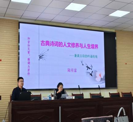 应北疆文学与文化传承研究基地邀请,叶嘉莹先生博士生、内蒙古师范大学文学院院长、陆有富教授来我院交流讲座。12月3日下午陆教授在明德楼A411做了题为“古典诗词的人格修养与人生境界——兼谈古典诗歌的吟诵传统”的学术讲座。讲座由刘红红教授主持。相关专业老师和同学到场聆听。